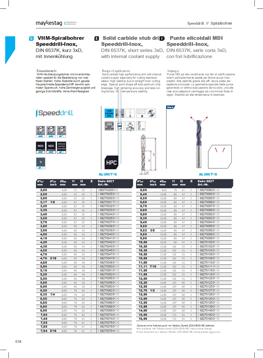 Tvrdokovové vrtáky na nerezové materiály s modrým krúžkom. Modrý krúžok označuje použiteľnosť do materiálov: nerez, kyseline odolné ocele, zliatiny hliníka ( tvorí sa dlhá trieska), meď a zliatiny medi ( tvorí sa dlhá trieska). Vrtáky sú v prevedení iba S VNÚTORNÝM CHLADENÍM. Pri vŕtaní otvorov je zabezpečená odolnosť vrtáka voči vysokej teplote.