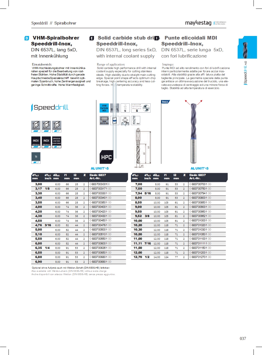 Tvrdokovové vrtáky na nerezové materiály s modrým krúžkom. Modrý krúžok označuje použiteľnosť do materiálov: nerez, kyseline odolné ocele, zliatiny hliníka ( tvorí sa dlhá trieska), meď a zliatiny medi ( tvorí sa dlhá trieska). Vrtáky sú v prevedení iba S VNÚTORNÝM CHLADENÍM. Pri vŕtaní otvorov je zabezpečená odolnosť vrtáka voči vysokej teplote.